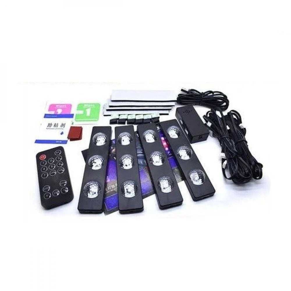 تشمل العبوة: 4 × أضواء شريط LED للسيارة SMD5050؛ 1 × جهاز تحكم عن بعد ملون؛ 1 × صندوق تحكم بالأشعة تحت الحمراء الأبيض؛ 1 × شاحن سيارة