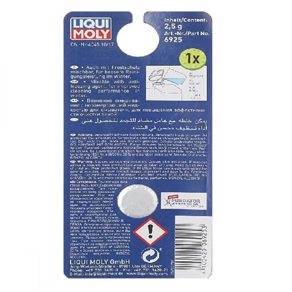 كبسولة تضاف الى ماء المساحات لزيادة فعالية الماء وتنظيف زجاج السيارة من ليكوي مولي -6925، هذا القرص يستخدم لتنظيف الزجاج الأمامي لأنظمة غسيل الزجاج الأمامي في كل من الشتاء والصيف.